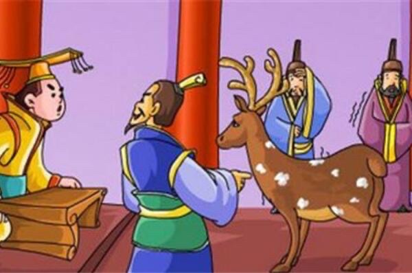 在朝堂上,赵高对胡亥说自己得到了一匹神骏的宝马想要送给胡亥。胡亥听闻非常的高兴,连忙命令宫中的侍卫将赵高说的骏马拉到朝堂上,让百官共同欣赏。当侍卫把赵高所说的骏马拉到朝堂上时,众人见到这明明是只鹿,而不是一匹马。胡亥大笑道“丞相莫不是糊涂了,这分明是只鹿,哪里是只马呢。”对此赵高却坚持称这是一直马,然后在一旁偷偷观察文武百官的反应。