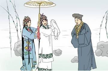 东晋时期,浙江上虞县祝家庄,玉水河边,有个祝员外之女英台,美丽聪颖,自幼随兄习诗文,慕班昭、蔡文姬的才学,恨家无良师,一心想往杭州访师求学。祝员外拒绝了女儿的请求,祝英台求学心切,伪装卖卜者,对祝员外说:"按卦而断,是让令爱出门的好。"