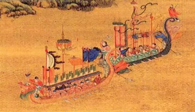 在历代的龙舟中,隋炀帝搭乘的龙舟大概是最豪华富丽的。东京梦华录说它长有三四十丈,宽三四丈,船头到船尾的鳞和须上都雕镂着金饰,船上两边有十几处阁子,中间设了御座,上面还有层楼和观赏台。龙头上有专门的人舞旗,左右水棚排列如桨,很像飞腾在空中。