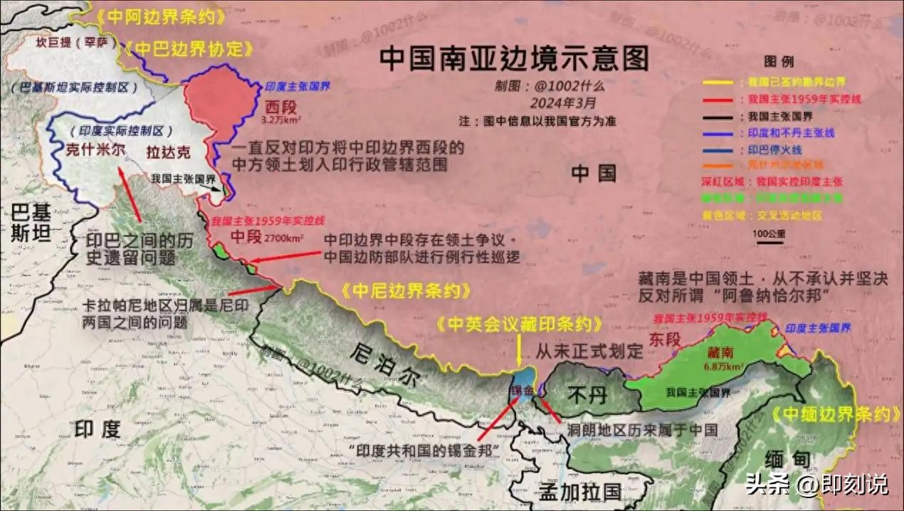 最具争议的是“麦克马洪线”,由英国在1914年与西藏地方政府签订的《西藏条约》划定,将当时属于中国的藏南地区划归英属印度。该线被印度视为中印之间的正式边界,但中国政府一直未承认其合法性,认为其是基于不平等条约下的非法划分。尤其是在中国中央政府未曾参与谈判的情况下,这条边界线在中国人眼中始终不具合法性。