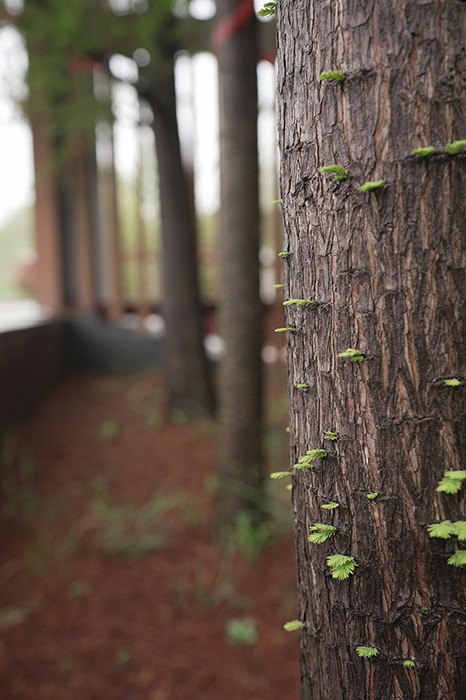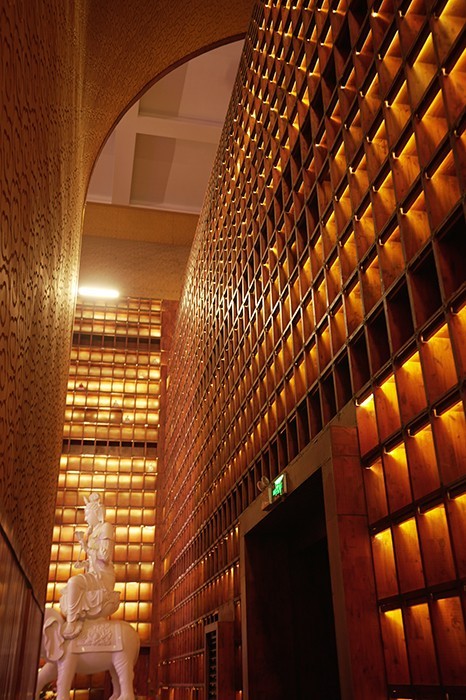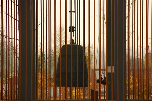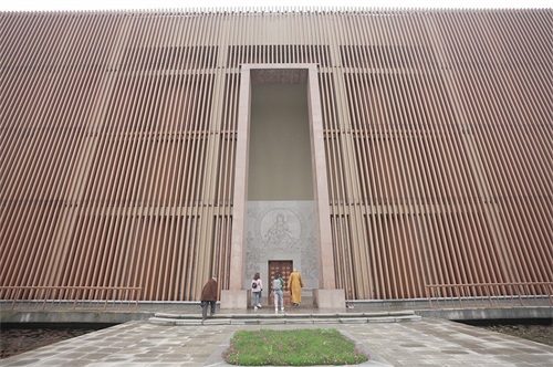 各殿外立面采用仿木金属格栅围护,东面的寺门延续了寺庙一贯采用的红色平开木门,将现代与古典寺庙元素相结合,两侧的钟楼及鼓楼采用了木格栅通透的处理手法,让为世人祈福的钟声传得更远。