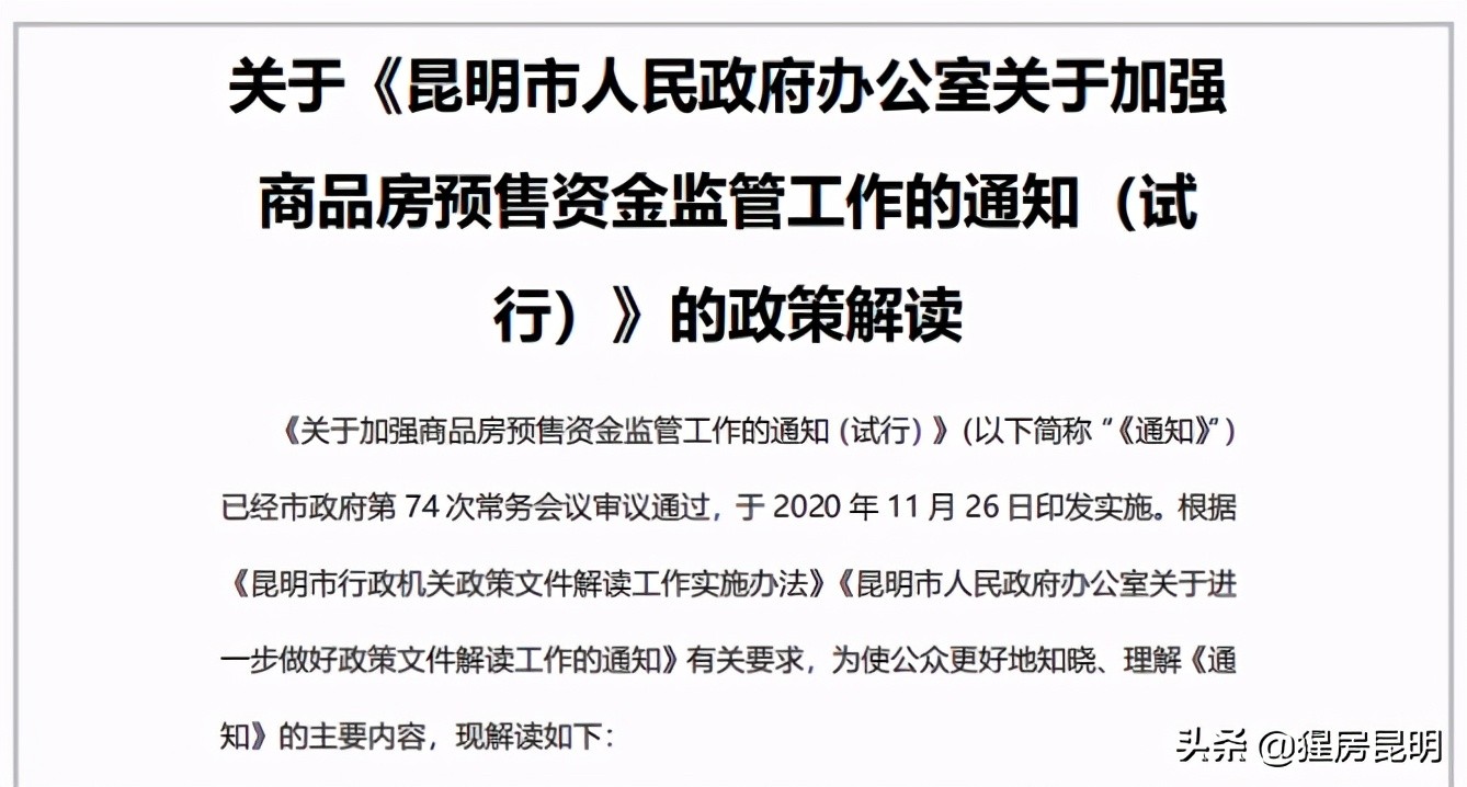 昨晚,昆明发布了《昆明市人民政府办公室关于加强商品房预售资金监管工作的通知(试行)》。