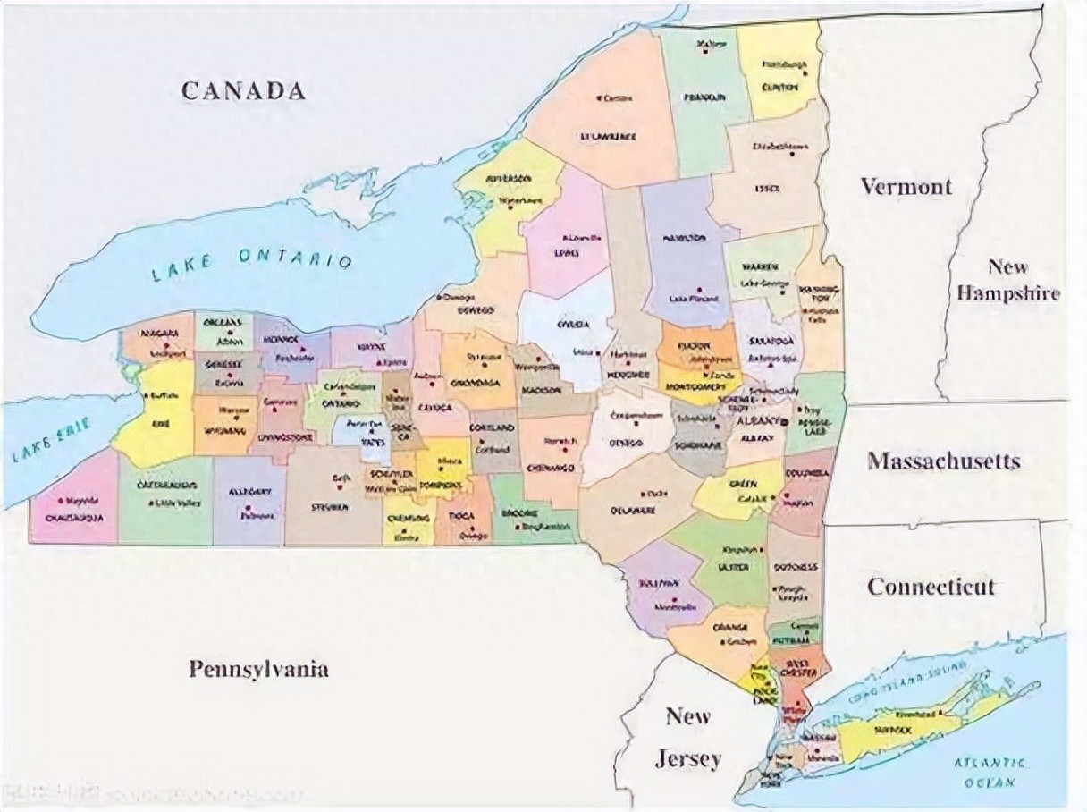 纽约州别称帝国州,位于美国东北部,与宾夕法尼亚州、新泽西州、康涅狄格州、马萨诸塞州、佛蒙特州相邻,西北与加拿大接壤。