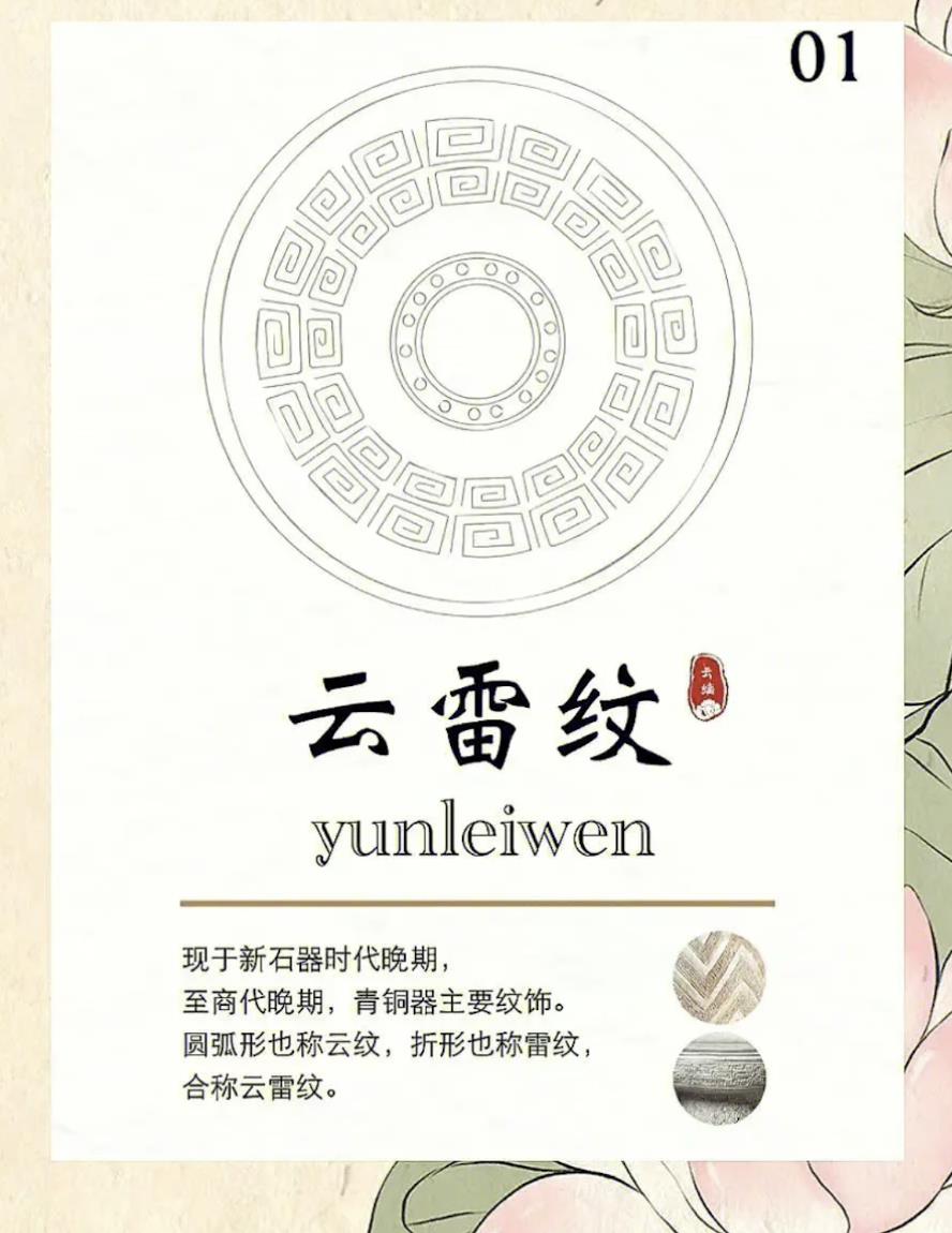 现于新石器时代晚期,至商代晚期,青铜器主要纹饰。圆弧形也称云纹,折形也称雷纹,合称云雷纹。