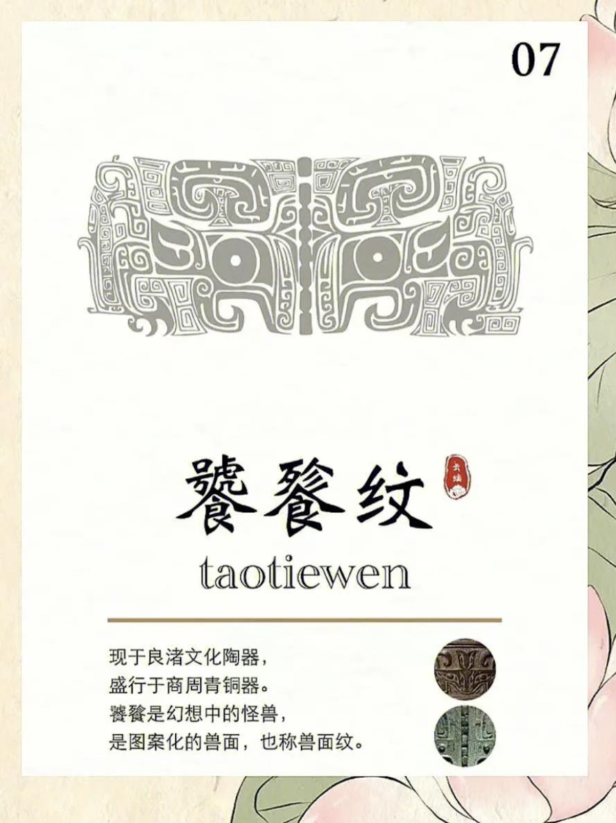 现于良渚文化陶器,盛行于商周青铜器。饕餮是幻想中的怪兽,是图案化的兽面,也称兽面纹。