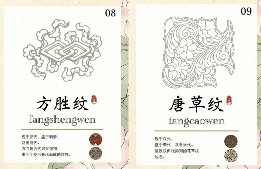 现于汉代,盛于明清,及至当代,方胜是古代妇女饰物,由两个菱形叠压而成的纹样。现于汉代,盛于唐代,及至当代。呈波纹曲线排列的花草纹。
