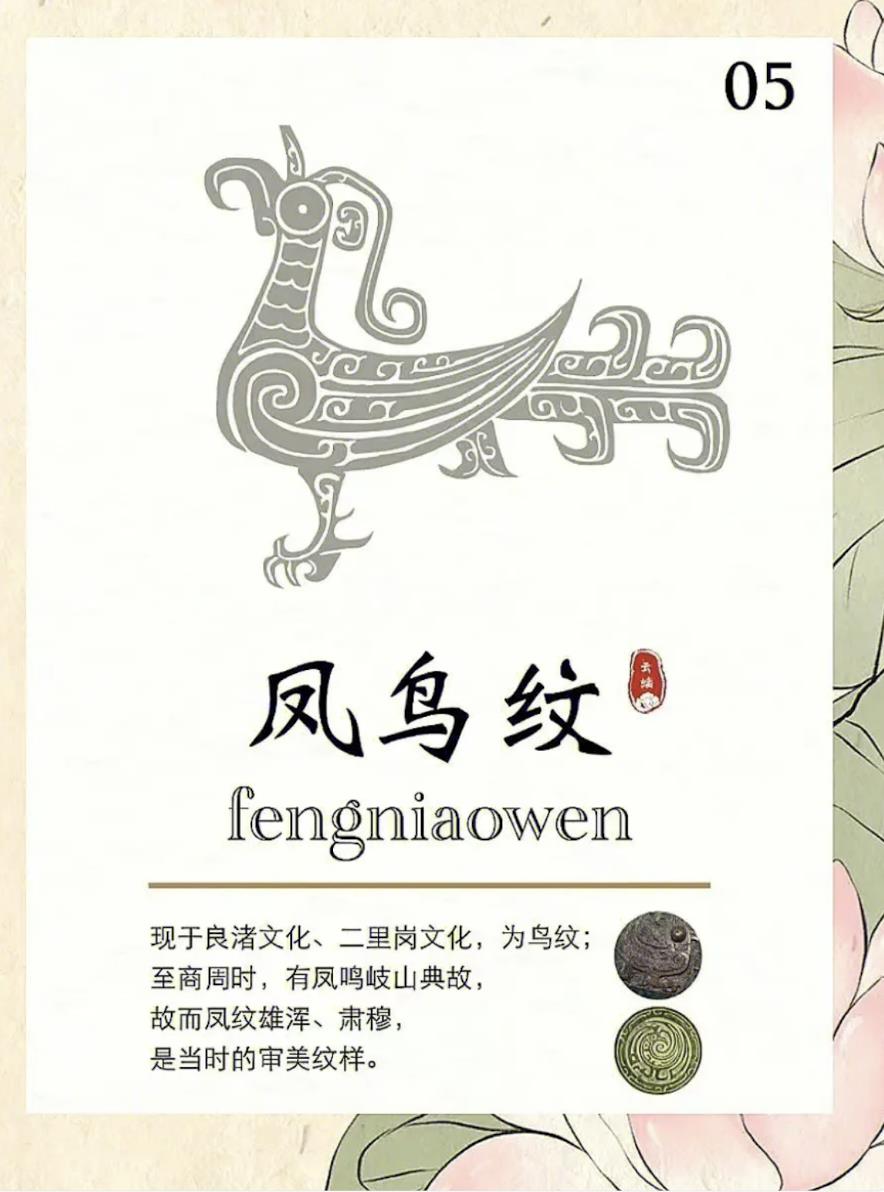 现于良渚文化、二里岗文化,为鸟纹;至商周时,有凤鸣岐山典故,故而凤纹雄浑、肃穆,是当时的审美纹样。