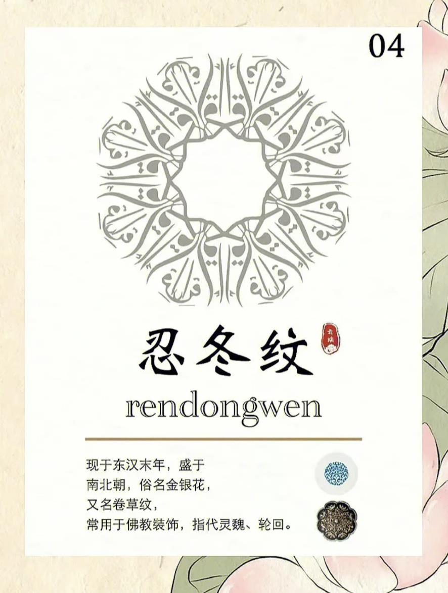 现于东汉末年,盛于南北朝,俗名金银花又名卷草纹,常用于佛教装饰,指代灵魏、轮回。