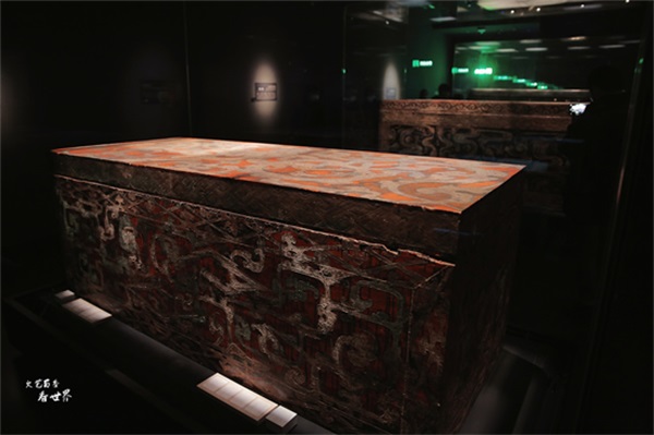 辛追夫人的棺材第一层是黑漆素棺、第二层是以黑漆为底,绘有彩绘、第三层以红漆为底,绘有彩绘、第四层外面用橘红和青黑二色羽毛贴成了菱形图案,盖板上覆盖着一张长达两米的T型帛画,如今这些文物在湖南省博物馆均可以见到。