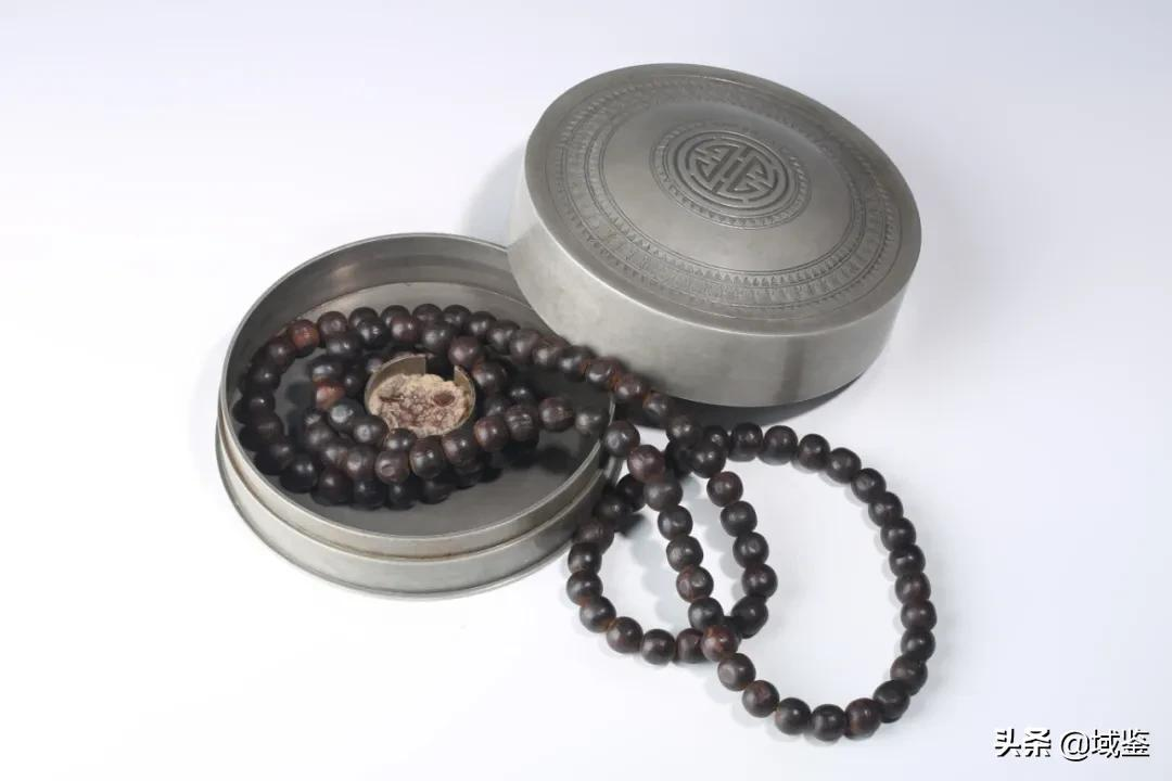 此串奇楠沉香佛珠便是由锡盒装藏,盒圆形,共分三层,严丝合缝,分量不俗,盖面錾刻寿字纹,形制规整,为沉香量身打造。