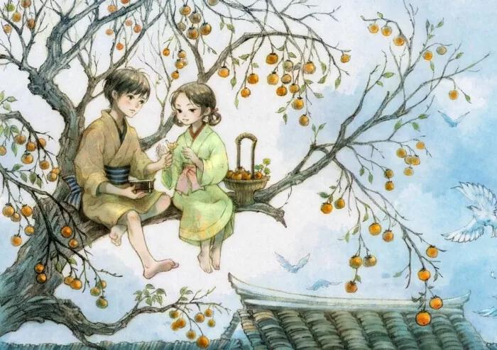 我的头发刚刚盖过额头,便同你一起在门前做折花的游戏。