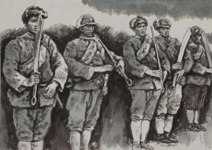 大刀虽是杀敌的利器,但与敌人近战时要发挥它的威力,还要靠大无畏的勇气。战士们用自己的生命和血泪对付敌人精良的装备。抗战精神凝练成最锋利的刀锋,向着侵略者的头上砍去!