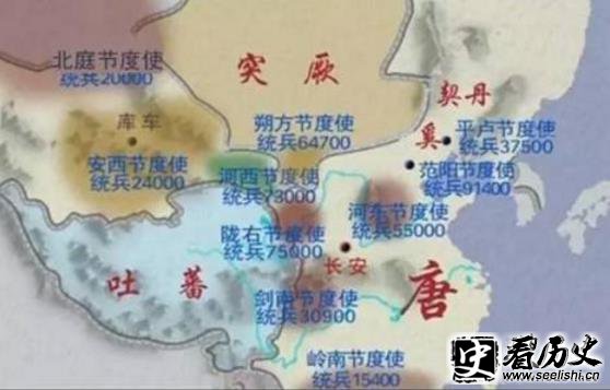 唐玄宗李隆基在位时期,为防止周边各族的进犯,大量扩充防戍军镇,设节度使,赋予军事统领、财政支配及监察管内州县的权力,共设九个节度使和一个经略使。