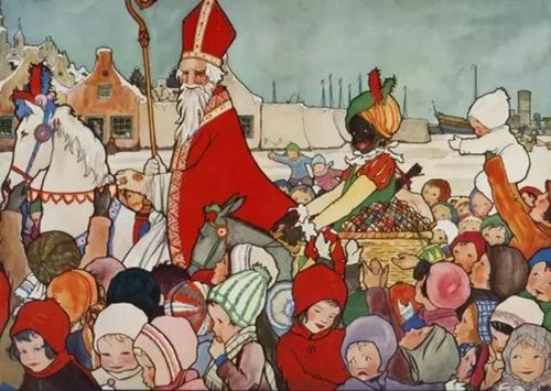 荷兰殖民者来到美洲时,将他们的Sintirklass主教也带了去,Sintirklass身着红袈裟,骑着一匹白马。Sintirklass的美国形象后来逐渐演变成一个快乐的老精灵。起初美国作家华盛顿.欧文在他的喜剧《纽约的历史》中将他描述成一个又圆又胖的荷兰老人。1823年,诗人Clement Moore在他的诗歌《St.Nicholas印象》中继续将Sintirklass/Saint Nicholas的形象戏剧化。