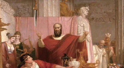 有一次,迪奥尼修斯让他坐在帝王的宝座上,头顶上挂着一把仅用一根马鬃系着的利剑,以此告诉他,虽然身在宝座,利剑却随时可能掉下来,帝王并不多福,而是时刻存在着忧患。