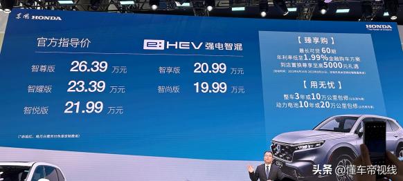 6月16日,新一代东风本田CR-V e:HEV(油电混动版)于2023粤港澳大湾区车展正式上市,官方指导价为19.99万元起。该车定位为紧凑型SUV,整体设计风格与全新CR-V燃油版保持一致,动力方面搭载了本田第四代i-MMD混动系统,包含2.0升自然吸气发动机和驱动电机,其中发动机最大功率为110千瓦。