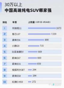 智电出行了解到,在30万以上中国高端纯电SUV上险量(3月1日-3月26日)排名中,阿维塔11以1,673辆的成绩夺得冠军,智己LS7位居次席,而大家熟知的比亚迪唐EV仅排第5,同期上险量还不到阿维塔11和智己LS7的一半。