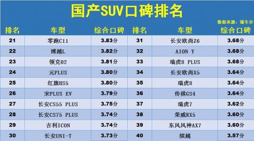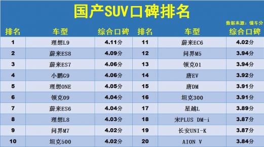 导读:日前获悉,2023年国产SUV口碑最新排名正式更新,本期依然只有40款车型入榜,其中口碑评分达到4分及以上的车型共有11款,较往期相比略有增加。具体来看,而在大趋势之下,国产新能源SUV的表现都比较不错,理想汽车的旗舰SUV理想L9,口碑评分达到了4.11分,蔚来ES7、小鹏G9、理想L8和问界M7也都是表现亮眼。而坦克500、比亚迪唐DM、吉利星越L、宋PLUS DM-i和长安UNI-T等车型,口碑评分也都处于行业领先。吉利博越L、比亚迪元PLUS、红旗HS5、长安CS75 PLUS、埃安AION Y和奇瑞瑞虎8等月销过万的主流国产SUV,口碑评分也比较令人满意。国产SUV口碑榜更新:1-40名,理想L8前10,星越L、CS75 PLUS上榜!