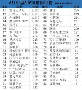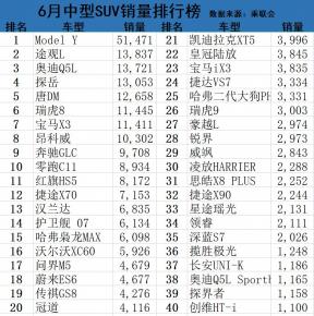 根据懂车帝排行榜6月销量数据统计,在6月中型SUV销量排行榜当中,有83款车型有销量数据,其中Model Y高居第1,瑞虎8拿到第6,护卫舰07跌出前10!