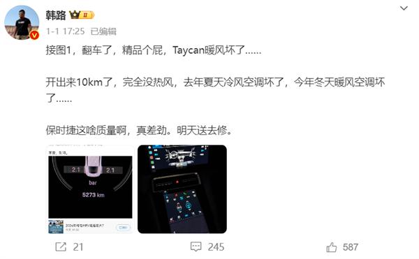 无独有偶,知名车评人韩路也曾吐槽过保时捷 Taycan 的空调,他表示,他家的 Taycan 夏天冷风空调坏了,今年冬天空调暖风又坏了,他本人对保时捷的质量相当无语。