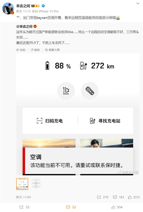 快科技 1 月 8 日消息,日前,微博 CEO@ 来去之间吐槽保时捷,连远程空调都做不好,知道为什么这年头开过国产新能源的车主,就会放弃 BBA 了。