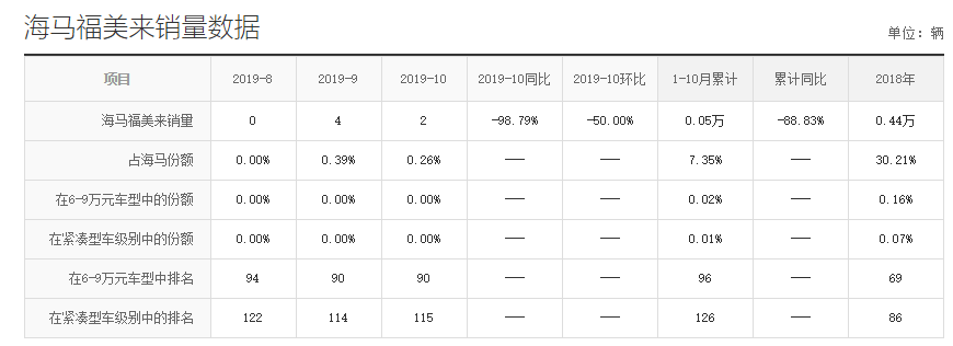 时间去到2017年4月,福美来单月销量跌到970辆,之后越来越少。2019年10月,某汽车销量网站上显示福美来的单月销量数字:2。