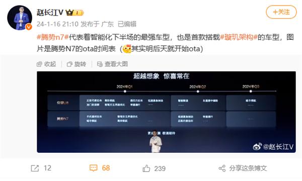 比亚迪腾势销售事业部总经理赵长江在微博发文称:" 腾势 N7 代表着智能化下半场的最强车型,也是首款搭载璇玑架构的车型。"