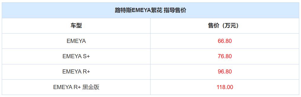 1 月 18 日,路特斯旗下全新纯电动大型轿跑车 EMEYA 正式上市销售,该车中文名为 " 繁花 "。它搭载双电机,前电机最大功率为 225 千瓦,后电机最大功率为 225/450 千瓦,CLTC 续航里程可达 600km。其车身包含诸多主动式空气动力学组件,主打驾控,共推出包含特别版的 4 个版本,售价为 66.80-118.00 万元。官方表示用户下定后 6 到 8 周内完成交付。