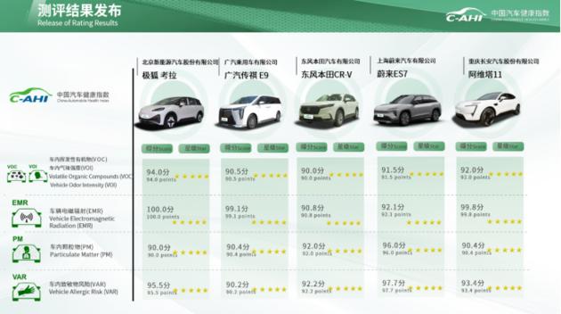 C-AHI 中国汽车健康指数发布 13 款车型在车内挥发性有机化合物与车内气味强度(VOC&VOI)、车辆电磁辐射(EMR)、车内颗粒物(PM)、车内致敏风险(VAR)四个板块的测评结果。