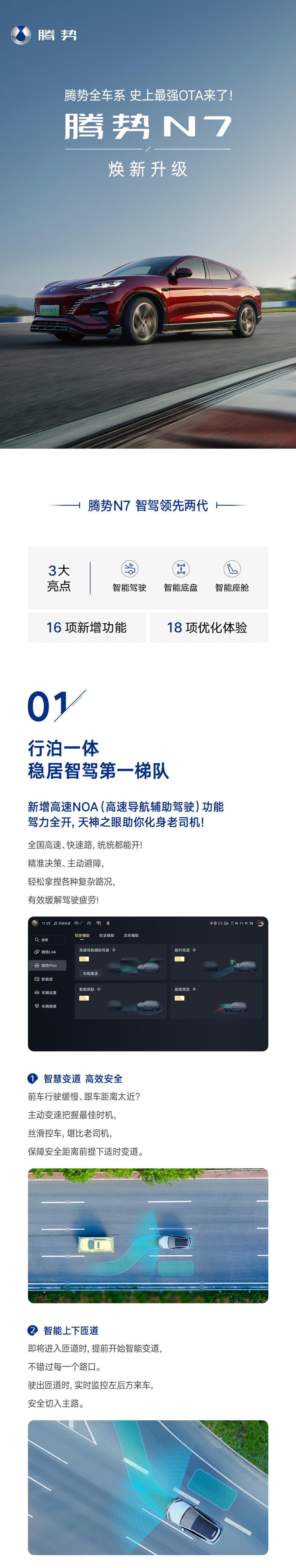 腾势 N7 高快领航功能通过 " 天神之眼 " 高阶智能驾驶辅助系统 + 智能底盘云辇 -A(标准版)组合,可实现遇低速车辆主动变道超车、遇加塞车辆主动减速、遇施工路段主动避让、智能上下匝道更换高速、稳稳通过大曲率弯道等强大功能。