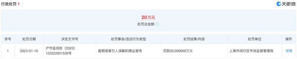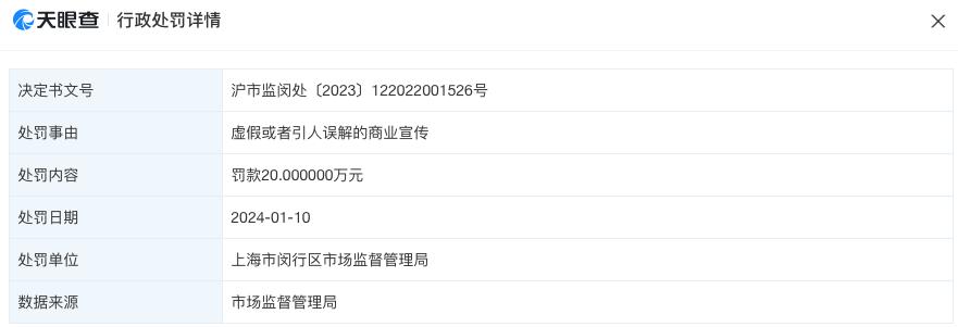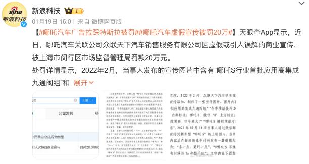 日前,天眼查信息显示,哪吒汽车关联公司众联天下汽车销售服务有限公司(下称 " 众联天下 ")因虚假或引人误解的商业宣传,被上海市闵行区市场监督管理局罚款 20 万元。