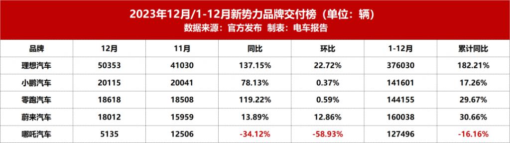 虽然哪吒汽车旗下车型并不少,但其 2023 年的发展并不顺利。官方数据显示,2023 年哪吒汽车累计交付 127496 辆新车,同比下滑 16.16%,其中 2023 年 12 月仅交付 5135 辆,连续 6 个月排名 " 垫底 "。值得一提的是,2022 年哪吒汽车是造车新势力的销冠,累计交付 152073 辆。