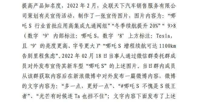 至于众联天下汽车销售服务有限公司为何会被罚?据网上曝光的上海市闵行区市场监督管理局处罚内容显示,2022 年 2 月,众联天下发布的宣传图片中含有 " 哪吒 S 行业首批应用高集成九通阀组 " 和 " 冬季续航提升 20%" 宣传用语,对外表达新上市的哪吒 S 型汽车是业内首批配备九通阀组的车型以及配备后能在冬季提升 20% 续航里程的含义。经查,众联天下上述宣传内容对其哪吒 S 型汽车的性能、功能、质量等作引人误解的商业宣传,欺骗、误导消费者。另外,宣传图片中标注 9 大于 8 文字图形组合,9 代表哪吒 S 所用的九通阀组,8 代表特斯拉所用的八通阀组,9 的亮度更高、字号更大,并在两个数字周围分别标注哪吒 S 和 Tesla 标识。该宣传图片通过 9 大于 8、哪吒 S 使用九通阀组后冬季续航里程提高 20% 的表达方式,编造哪吒 S 优于特斯拉的误导性信息,损害特斯拉汽车的商业信誉、商品声誉。