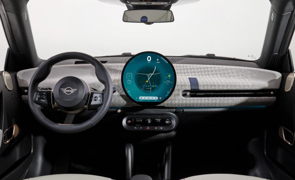 内饰方面,参考海外版车型,全新 MINI COOPER 取消仪表盘,HUD 抬头显示系统将代替仪表盘的作用。中控屏幕依旧延续 MINI 标志性的设计,但不再是圆型里面切出一个长方形,而是实实在在的一整个圆形屏幕。此外,中控屏下方的按键区域也采用圆形的设计元素,与现款车型还是有着一定的传承。方向盘也采用全新的样式,同时放弃了经典的圆形空调出风口,而是采用了当下流行的贯穿式出风口。
