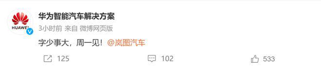 1 月 20 日,东风旗下的岚图汽车和华为智能汽车解决方案在微博上突然隔空喊话:" 字少事大,周一见!"
