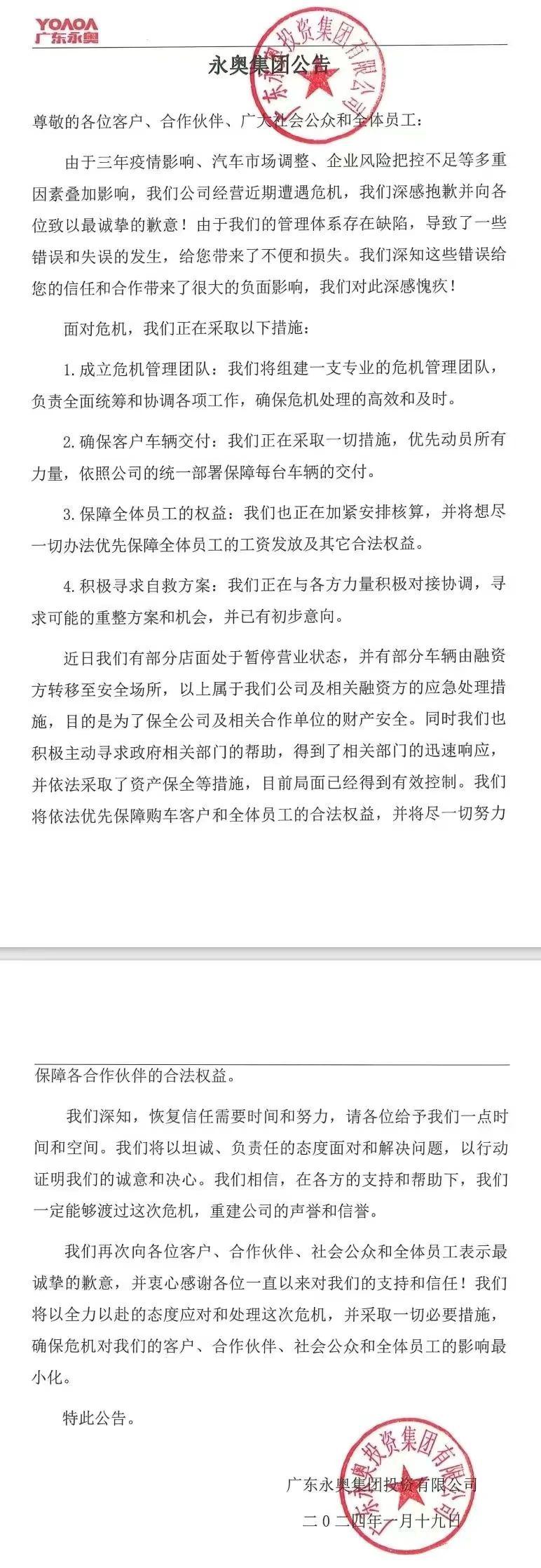 1 月 19 日,针对 80 余家 4S 店被查封、车主无法提车等消息,广东永奥集团发布公告回应:由于三年疫情影响、汽车市场调整、企业风险把控不足等多重因素叠加影响,公司经营近期遭遇危机。
