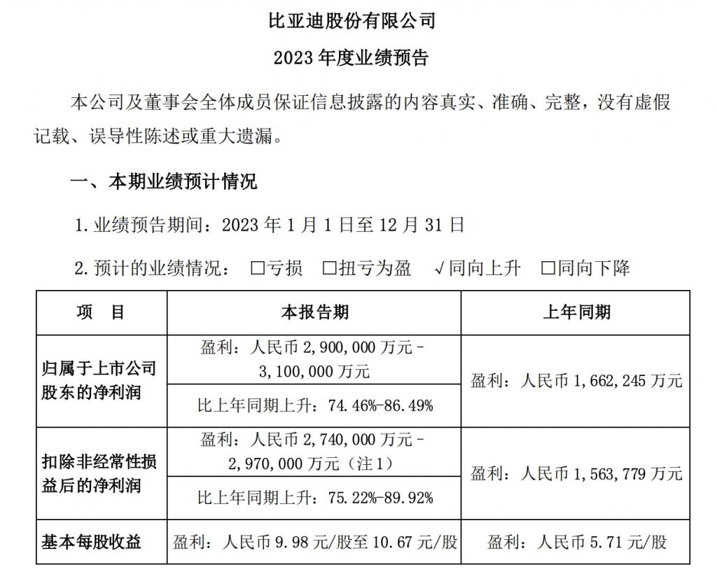 1 月 29 日晚,比亚迪发布 2023 年业绩预告显示,报告期内比亚迪预计实现净利润 290 亿元— 310 亿元,同比增长 74.46% — 86.49%;预计实现扣非净利润 274 亿元— 297 亿元,同比增长 75.22% — 89.92%。