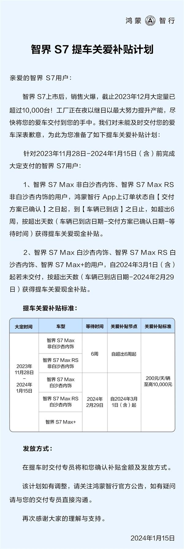 此外,1 月 16 日,智界官方表示截止 2023 年 12 月智界 S7 大定量已超过 10,000 台。