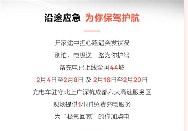 春节期间,极氪帮充电已上线全国 44 城,且在 2 月 4 日至 2 月 8 日及 2 月 16 日至 2 月 20 日,充电车驻守北上广深杭成都六大高速服务区,为车主现场提供 1 小时免费充电服务。