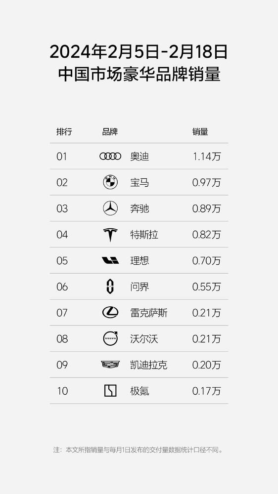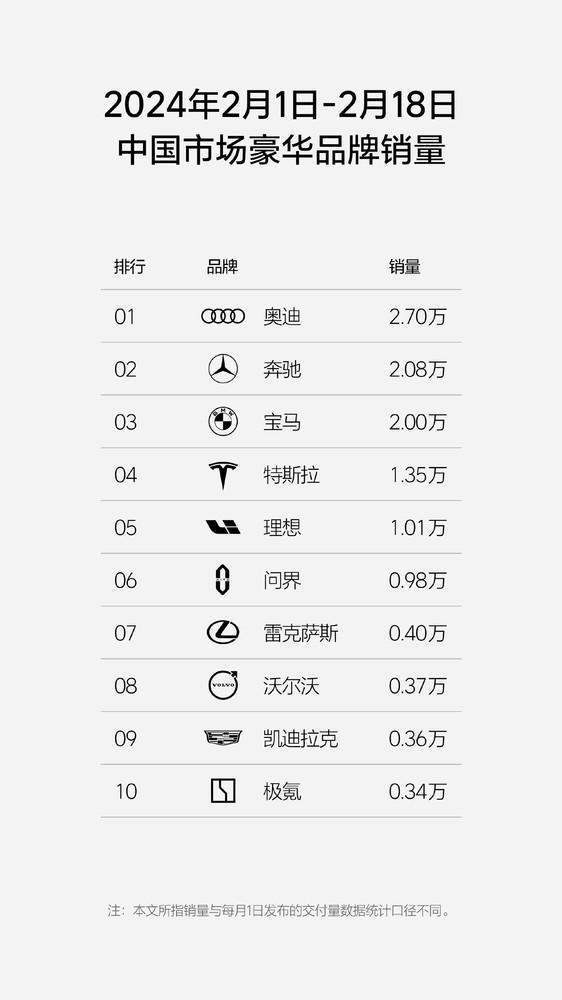 2 月 1 日至 2 月 18 日,中国市场豪华车销量前十分别为奥迪、奔驰、宝马、特斯拉、理想、问界、雷克萨斯、沃尔沃、凯迪拉克和极氪。其中,极氪排名第十,销量 0.34 万辆,而蔚来汽车同时间段内的销量为 0.28 万辆。