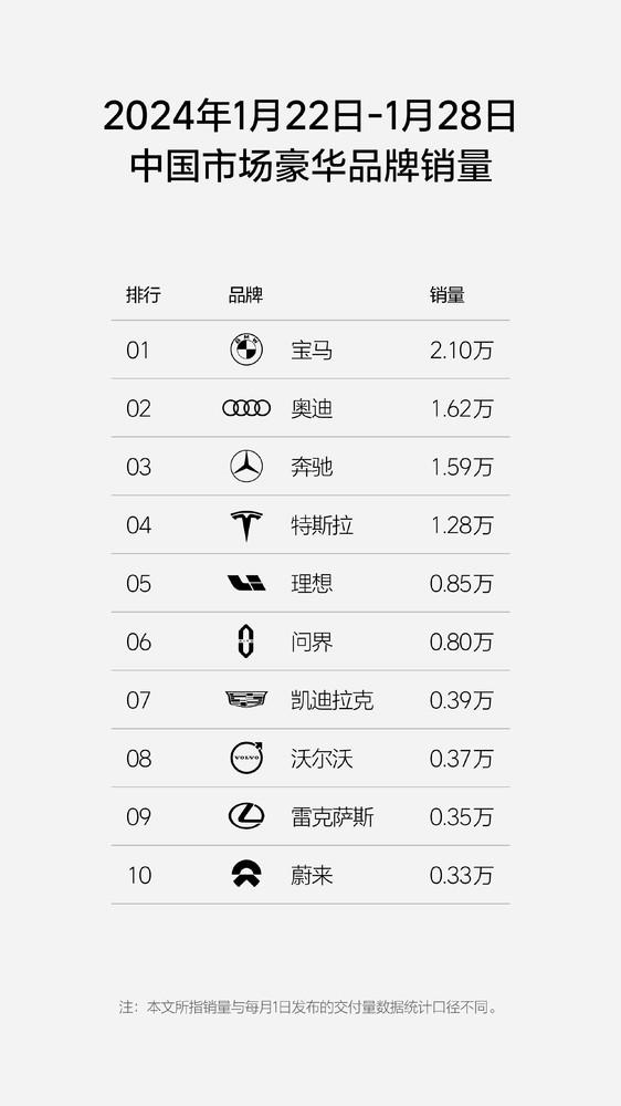 根据理想官方发布的数据,蔚来汽车上一次销量进入中国豪华车销量前十为 2024 年 1 月 22 日至 1 月 28 日。这周蔚来汽车销量为 0.33 万辆,位居中国豪华车销量第十名。同时期,宝马单周销量 2.10 万、奥迪 1.62 万、奔驰 1.59 万、特斯拉 1.28 万、理想 0.85 万、问界 0.80 万、凯迪拉克 0.39 万、沃尔沃 0.37 万、雷克萨斯 0.35 万。