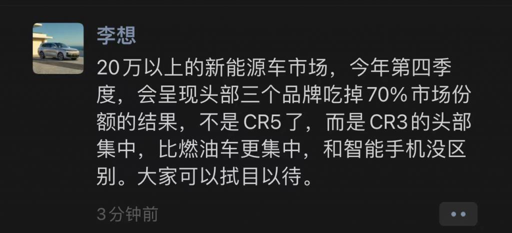 "20 万以上的新能源车市场,今年第四季度会呈现头部三个品牌吃掉 70% 市场份额的结果,不是 CR5 了,而是 CR3 的头部集中,比燃油车更集中,和智能手机没区别。大家可以拭目以待。" 业绩电话会结束后,李想在其微信朋友圈发布了上述文字。