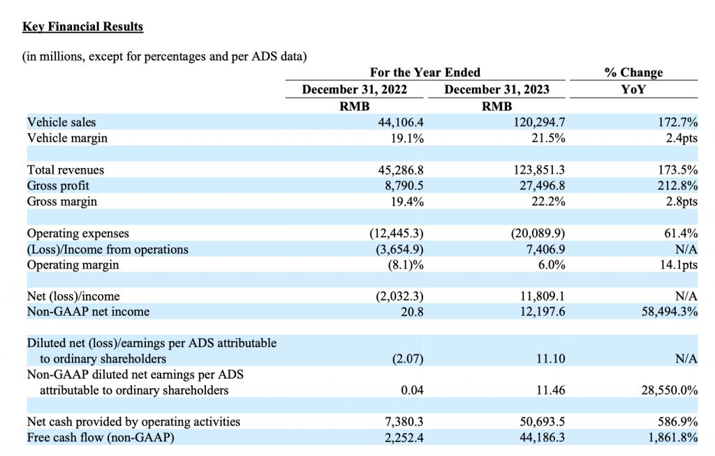 根据其(NASDAQ:LI)2 月 26 日公布的 2023 年第四季度及全年财报显示,其去年交付量同比增长 182.2% 至约 37.6 万辆;营收、净利分别达到 1238.5 亿元和 118.1 亿元,前者同比增长 173.5%,后者实现扭亏为盈;截至 2023 年末,其现金储备达到 1036.7 亿元。