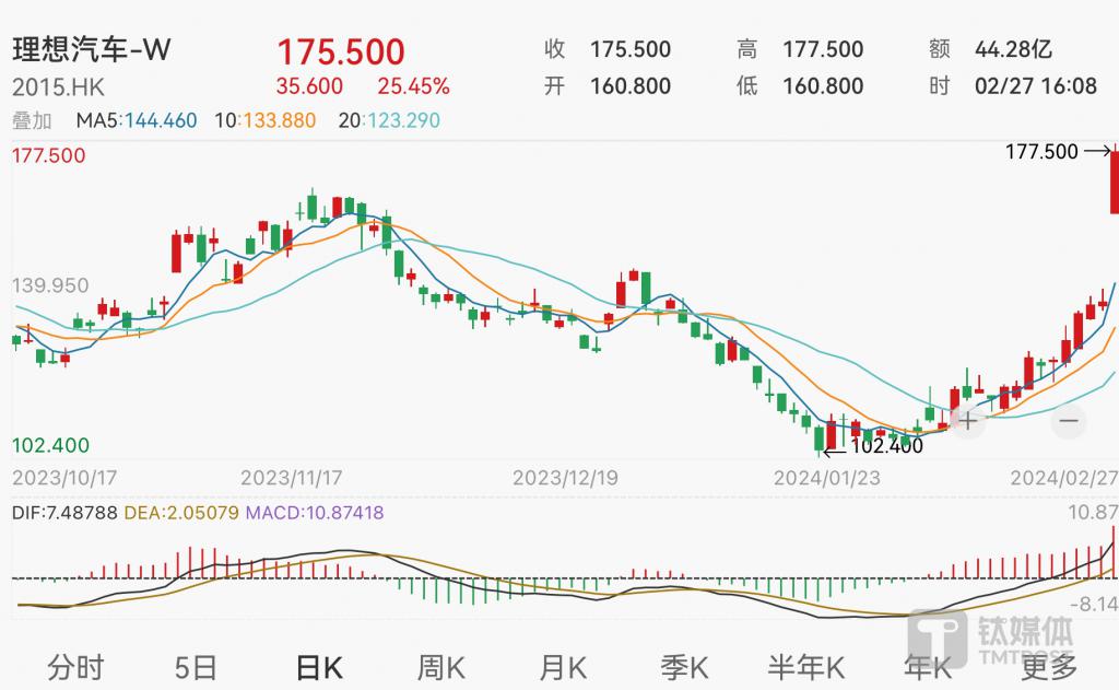 得益于业绩表现的亮眼,理想汽车 -W(02015.HK)在 2 月 27 日港股开盘后,便快速涨超 15%,此后一直保持着上扬走势。