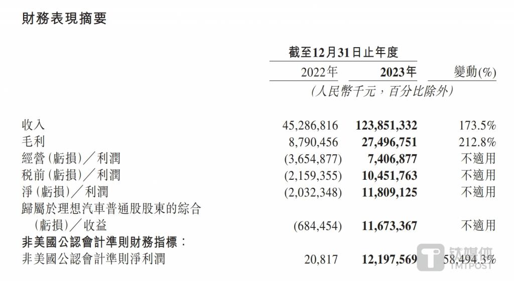 往期数据显示,2018 年至 2022 年,理想汽车 -W 累计净亏损约 64.75 亿元,其中 2022 年净亏损约 20.3 亿元,2023 年成功扭亏为盈,实现净利润约 118.09 亿元,填平了过往五年的累计亏损。