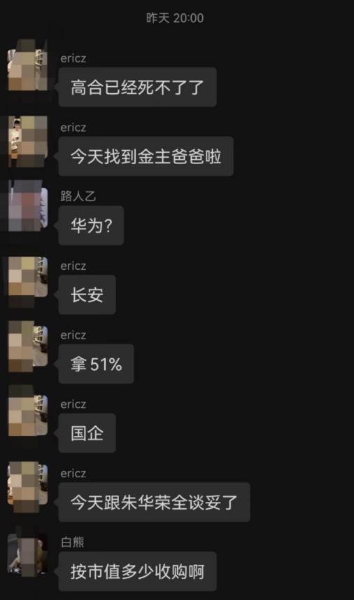 从网传的聊天记录来看,长安洽购高合 51% 股权,并称已经谈妥,长安出资会带动青岛与沙特资金到位,由此盘活高合汽车。