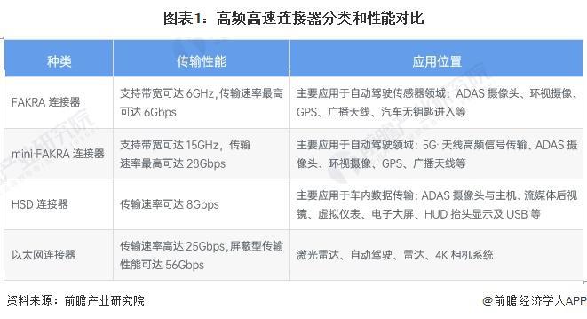现有高频高速连接器可分为四类,分别是 FAKRA 连接器、mini FAKRA 连接器、HSD 连接器和以太网连接器。其中,FAKAR 连接器是汽车行业通用标准的射频连接器,用于无线传输、传感器连接 ;mini FAKRA 连接器在其基础上进行了空间和传输优化 ;HSD 连接器传输效率高,属于差分高速传输,用于数据传输 ; 以太网连接器是未来汽车发展的主流连接器,适合高速传输和大数据传输。