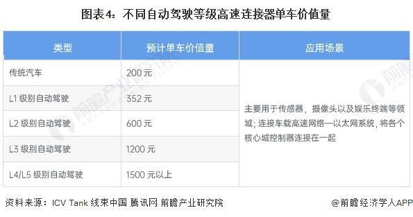 随着自动驾驶及智能座舱加速发展,车载传感器及智能座舱设备数量将增加,同时更多的网联应用以及城市自动驾驶场景中大量的数据收集和处理,对所需传输数据量将持续扩大,进而增加使用的高速连接器数量。随着自动驾驶等级的不断提升,高速连接器的单车价值量有望不断增加。