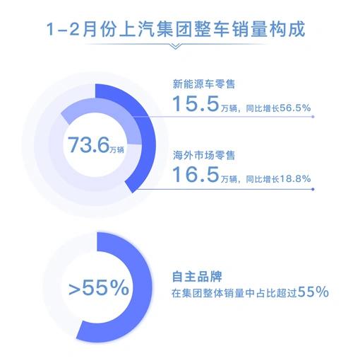 IT 之家此前报道,上汽集团 2024 年 1 月份实现整车批售 24.5 万辆,零售超过 45 万辆,同比增长近 50%。其中,新能源车零售超过 9 万辆。1-2 月份上汽集团零售 73.6 万辆,同比增长 10.8%,其中,新能源车零售 15.5 万辆,同比增长 56.5%;海外市场零售 16.5 万辆,同比增长 18.8%;自主品牌在集团整体销量中的占比超过 55%。