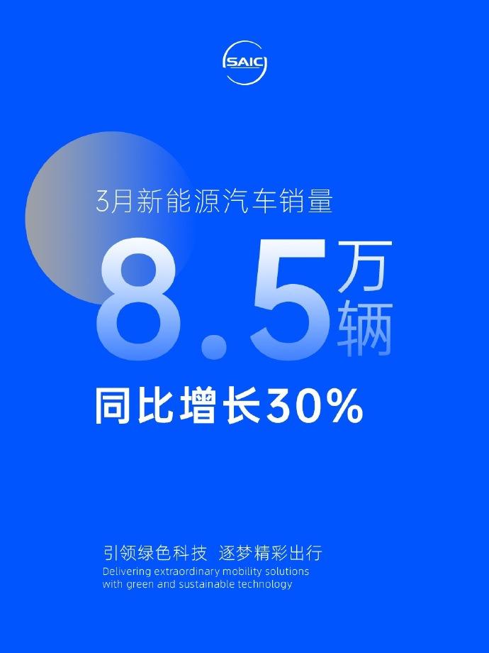 上汽集团 3 月份销售新能源汽车 8.5 万辆,同比增长 30%